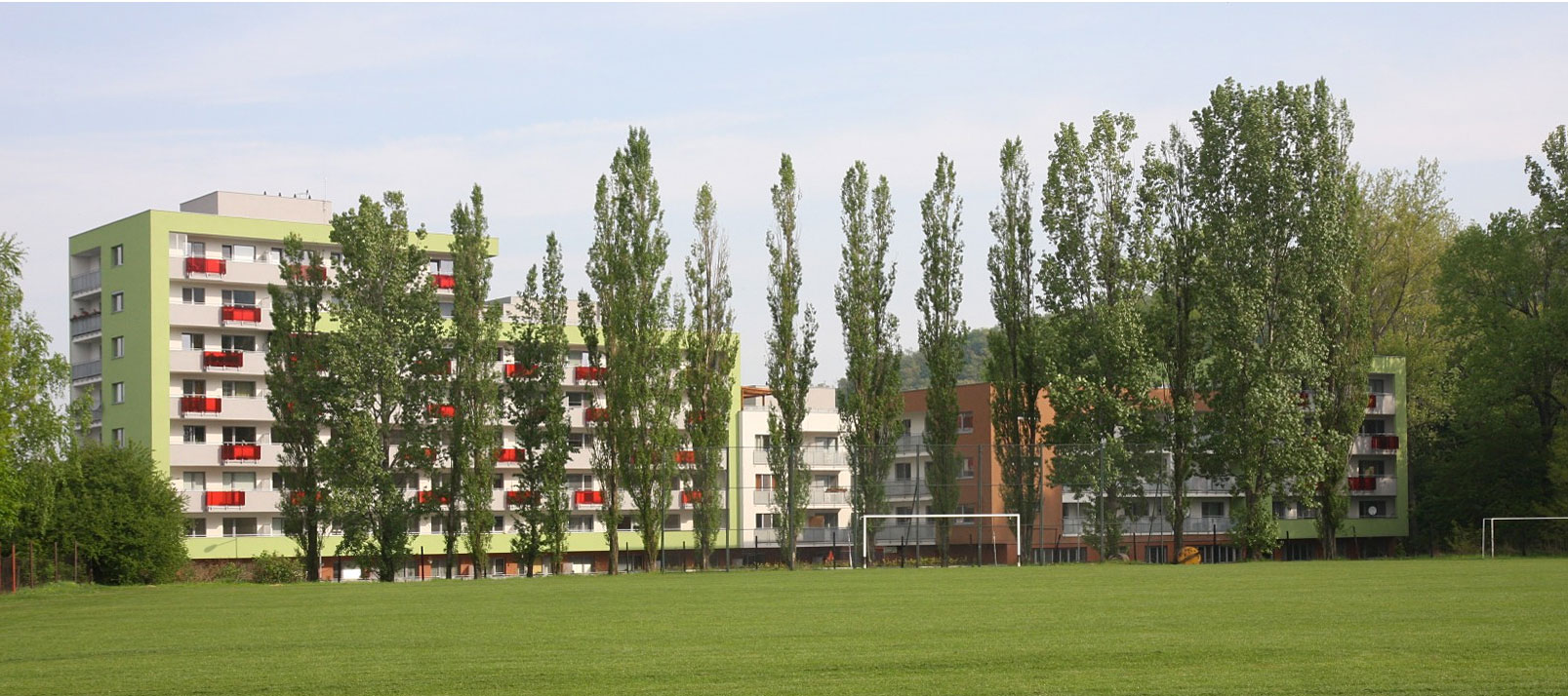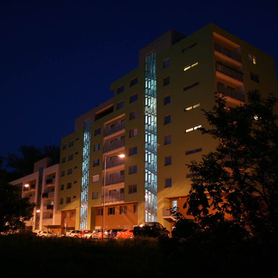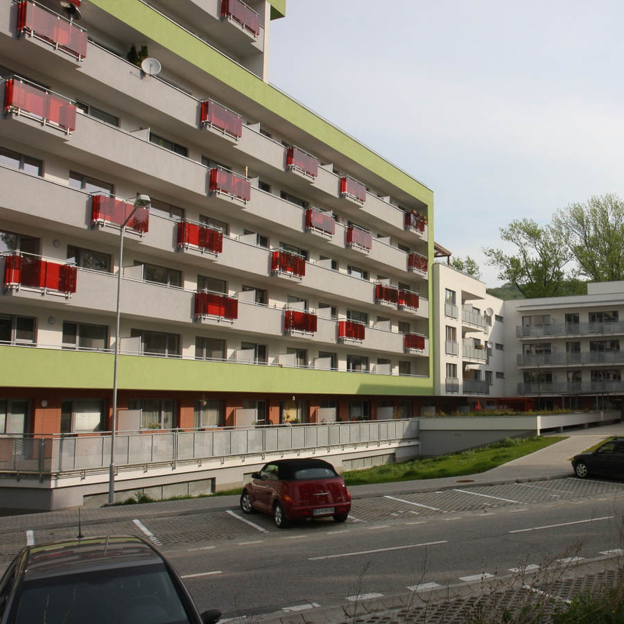 Byty sú dispozične rozdelené na dennú a nočnú časť. Denná časť je orientovaná na juh a západ a nočná časť je orientovaná na sever a východ. K dennej časti bytu vždy prislúcha balkón plochou primeranou k veľkosti bytu. Tomuto zámeru je podriadená aj škála architektonických a materiálových zámerov, kultivovanosti detailov a farebného vyznenia celku.